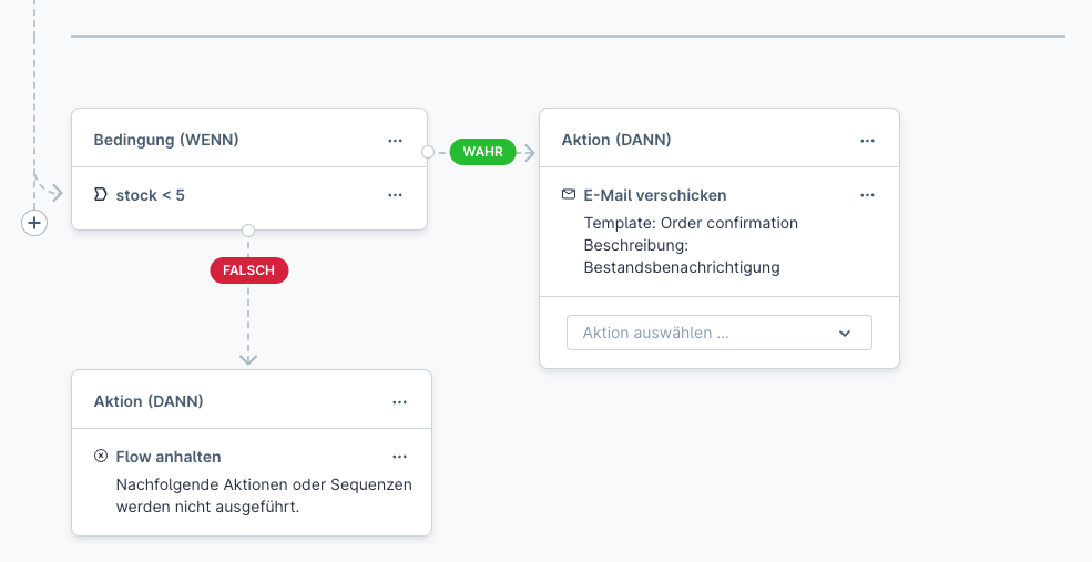 Wir haben nun das System aktiviert, eine Regel erstellt, die greift, wenn Produkte einen Lagerbestand unterschreiten und ein Mail-Template erstellt, welches wir nutzen möchten.