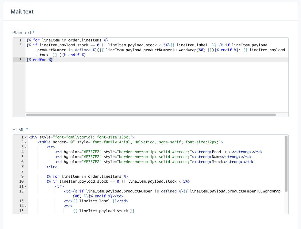 {% if lineItem.payload.stock == 0 || lineItem.payload.stock < 5%}{{ lineItem.label }} {% if lineItem.payload.productNumber is defined %}({{ lineItem.payload.productNumber|u.wordwrap(80) }}){% endif %}: {{ lineItem.payload.stock }} ){% endif %}